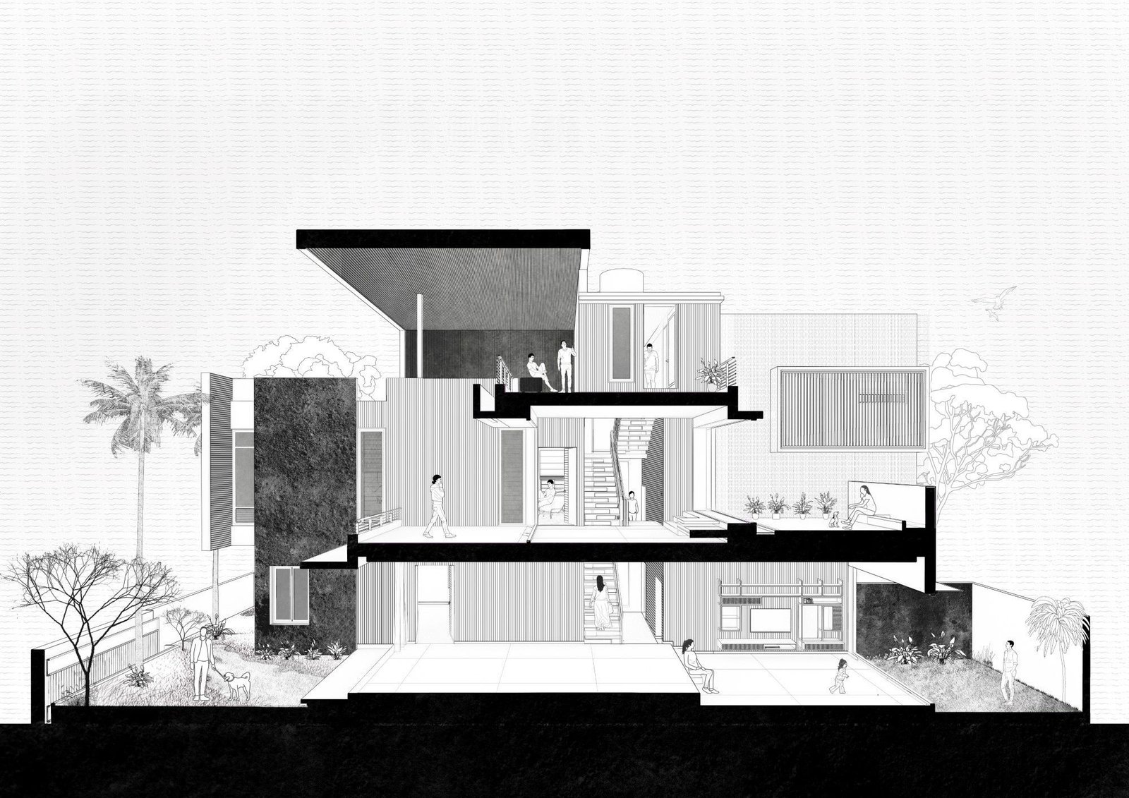 The entrance to the south-facing house is strategically positioned in the northeast quadrant, facing east. This activates the side margin, creating an entrance walk and court that culminates in a platform surrounding an existing mango tree. The entrance doorway, alongside the mango tree, serves as a pause point in this journey and is delineated by a stone wall separating it from the backyard garden, which is accessible from the living room.