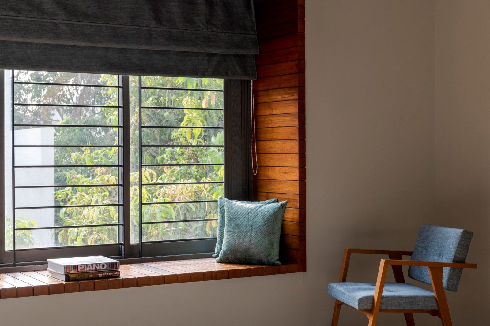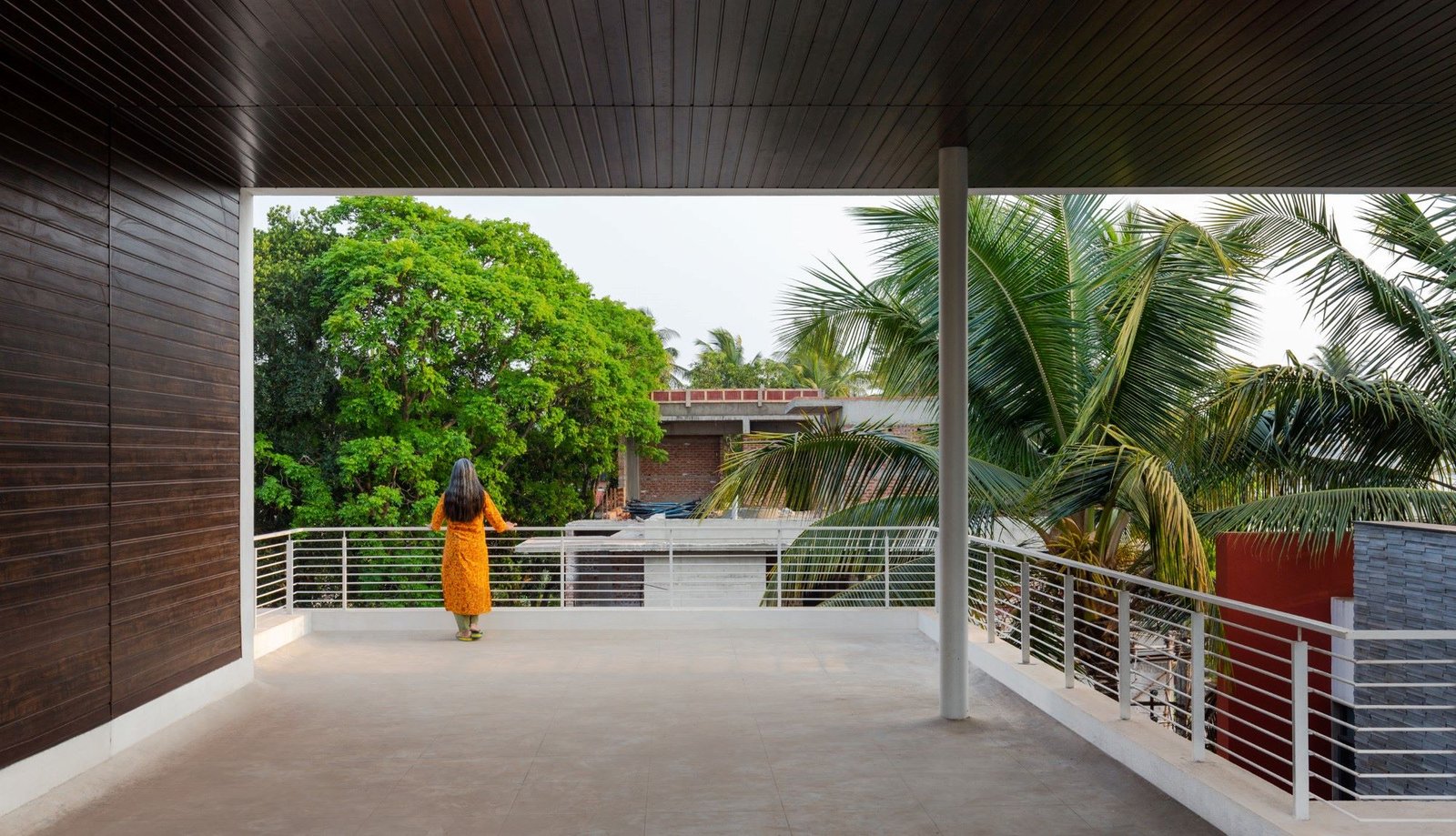 In plan, the organisation of the house can be understood as three bands that divide the space into distinct parts. The eastern band houses the kitchen, Pooja room, and a bedroom above, while the western band contains the bedrooms and staircase. The space between these seemingly solid bands becomes the interstitial zone that accommodates the living areas. On the facade, this manifests as transparent elements that allow glimpses of the surrounding environment. From the street, one encounters two opaque sets of volumes on either edge, with a central core that provides a visual pathway through the building, even offering glimpses of the sky.