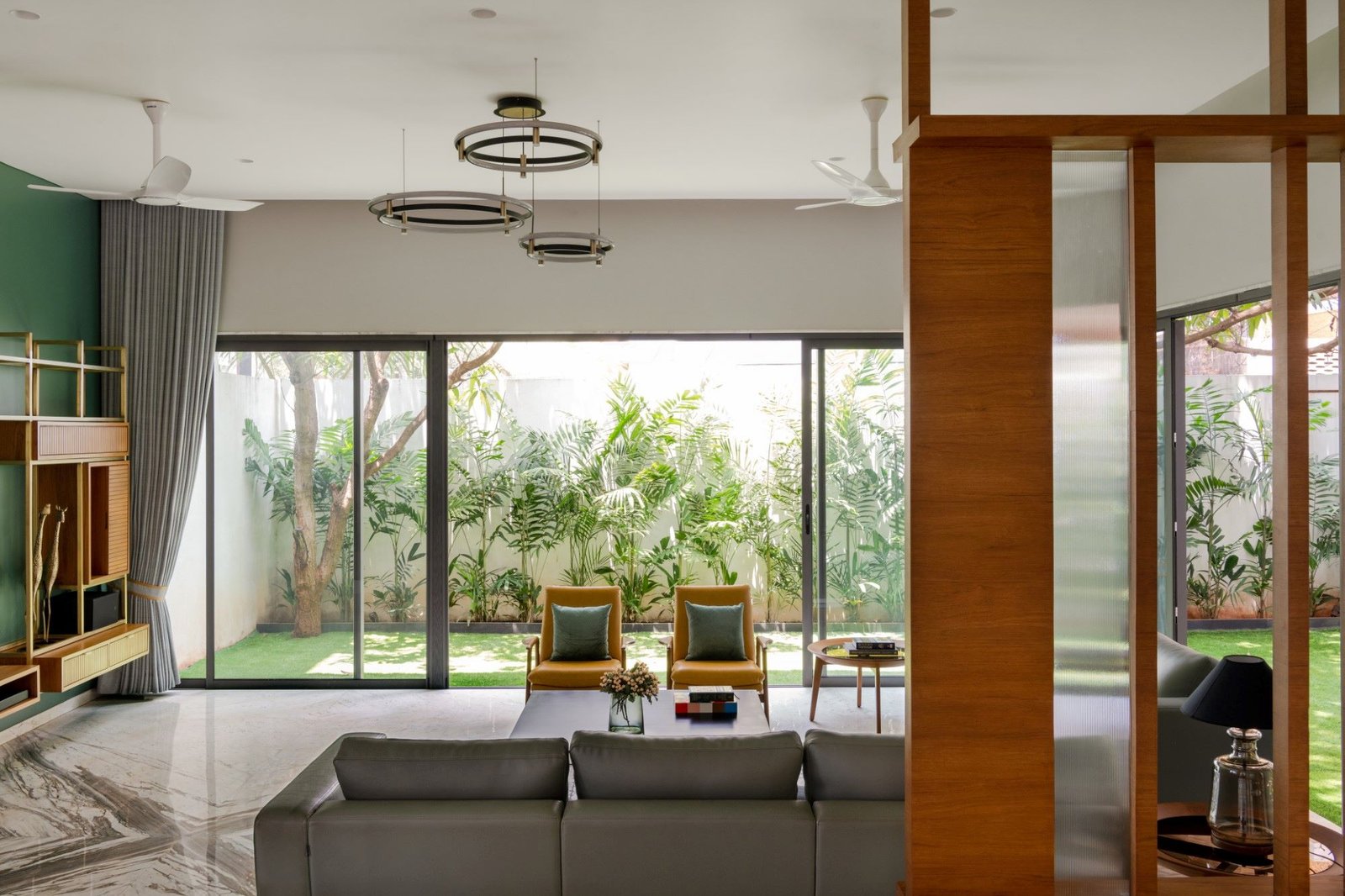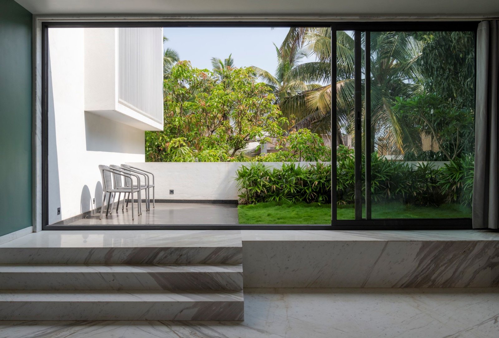 The design employs an interplay between peripheral outdoor spaces, living areas that open up to them, and core private spaces like bedrooms. This is achieved by contrasting the private spaces as enclosed volumes with the living spaces that offers transparency towards the exteriors. This physical and visual connection between the front garden court and the rear garden is facilitated by the amorphous living areas.